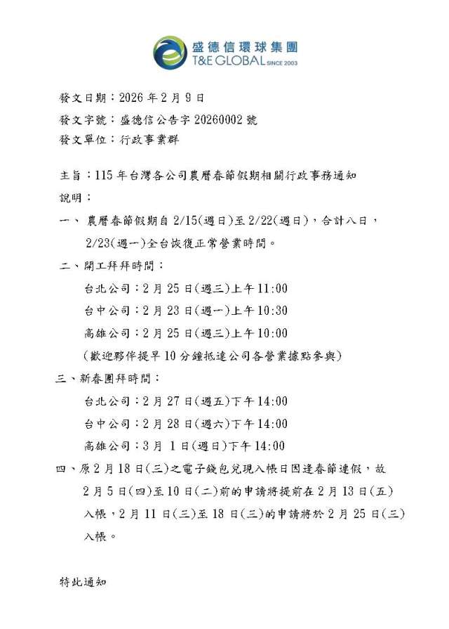 [公告]115年台灣各地公司農曆春節假期相關行政事務通知